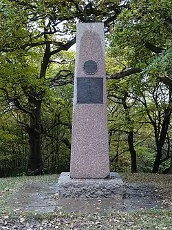 Pole Hill in Epping Forest lies directly on the Greenwich meridian and, being the highest point on that bearing directly visible from Greenwich, was at one time used as a marker by geographers at the Royal Observatory to set their telescopes and observation equipment to a true zero degree bearing.[5] On the summit of the hill is an obelisk made of granite and bearing the following inscription:[6]