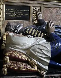 He died on 30 April 1596 of apoplexy, at his home, and is buried in Westminster Abbey,[21] where survives his magnificent monument,[22] displaying the arms of Chowne: Sable, three attires of a stag in pale argent.[23]