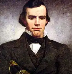 After Marr fell, first appeared former and subsequent Virginia governor and later major general William "Extra Billy" Smith, who had just resigned his seat in the U.S. Congress. He was from Warrenton and had helped raise the company. He took command in the absence of the company's leaders. Soon thereafter Lieutenant Colonel (later Lieutenant General) Richard S. Ewell, who had just been placed in charge of Confederate forces at Fairfax Court House, came upon the company. Lt. Col. Ewell had received a shoulder wound as he emerged from the village's hotel as the Union force first rode through the streets so he was bleeding as he took charge of the infantry company in the field and redeployed 40 of them.[15] Ewell soon went off to send for reinforcements and Smith redeployed the men again in the same general area but in a less exposed position about 100 yards forward.[16][17] After the Union cavalry rode through the village, they regrouped and returned through the village streets. A volley from the redeployed men of the Warrenton Rifles turned them back.[18] The Confederates fired additional volleys at the Federals as they tried to pass through town again on their way back to their base near Falls Church, Virginia.[18] After a third failed attempt to ride past the Confederates, the Union men were forced to leave town toward Flint Hill in the Oakton area of Fairfax County to the north of the City of Fairfax with several wounded men.[19]