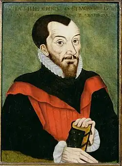 In 1572–73 Rainolds was appointed reader in Greek, and his lectures on Aristotle's Rhetoric made his reputation.[1] In 1576 he objected to the proposal that Antonio de Corro should be allowed to proceed Doctor of Divinity; and at the same time he was instrumental in having Francesco Pucci expelled from the university, Pucci being an associate and ally of Corro, who had moved against orthodox Calvinist positions.[2][4] Rainolds resigned his readership in 1578.[2] The popular, young scholar was promoted as a candidate for college president by many university authorities in 1579, when it was thought to be an opening for the position.[5]