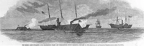 In July 1862, Tucker was ordered to Charleston, South Carolina, where he took command of the ironclad CSS Chicora.[4] The following January 31, he led his ship in a successful attack on Union warships off that port engaging several Federal ships, including the USS Keystone State, in a gun battle. He became commander of the Confederate warships at Charleston in March 1863, remaining in that post until the city fell in February 1865. During that time, he was promoted to captain and aggressively pursued spar-torpedo warfare against U.S. warships. He was ordered to scuttle his vessels and retreat to Wilmington, North Carolina after General William T. Sherman with his army came to Charleston. Tucker formed a marine detachment from the crews of ships which became known as Tucker's Marine Brigade.[5]