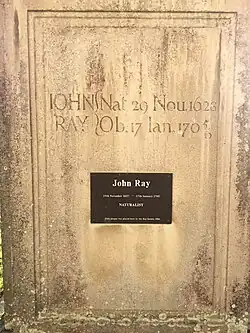 After leaving Cambridge in 1663 he spent some time travelling both in Britain and the continent.[9] In 1673, Ray married Margaret Oakley of Launton in Oxfordshire; in 1676 he went to Middleton Hall near Tamworth, and in 1677 to Falborne (or Faulkbourne) Hall in Essex. Finally, in 1679, he removed to his birthplace at Black Notley, where he afterwards remained. His life there was quiet and uneventful, although he had poor health, including chronic sores.[10] Ray kept writing books and corresponded widely on scientific matters, collaborating with his doctor and contemporary Samuel Dale.[11] He lived, in spite of his infirmities, to the age of seventy-seven, dying at Black Notley. He is buried in the churchyard of St Peter and St Paul, where there is a memorial to him. He is widely regarded as one of the earliest of the English parson-naturalists.[12]