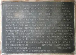 - Johannes Ridgeway Armiger vir libere et ingenue educatus acuti ingenii et in rebus agendis egregie versatus eoq nomine de patria et republica optime meritus summae et integrae fidei apud reges Henricum Octavum Edovardum Sextum et Mariam reginam. Pater Thomae Ridgeway hic conditi avus Thomae Ridgeway Militis filii haeredis eiusdem Thomae hoc loco etiam requiescens et cuius digna memoria nunc quoq(ue) posteritati com(m)endatur. Elizabetham Wentford faeminam omni laude dignam hac aede sepultam habuit conjugem e qua sobolem reliquit Thomam hic placide dormientem filium unicum haeredem filias vero duas primogenitam (Margaretam) Hugoni Earth Armi(ge)ro conjugatam alteram (Annam) ..... Prideaux Armigero in matrimonium datum