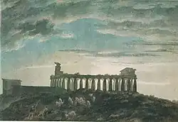 The son of the Russian-born drawing master and watercolourist Alexander Cozens, John Robert Cozens was born in London. He studied under his father and began to exhibit some early drawings with the Society of Artists in 1767. In 1776 he displayed the large oil painting, A Landscape with Hannibal in His March Over the Alps, Showing to His Army the Fertile Plains of Italy (now lost) at the Royal Academy in London.[2] This painting was the only oil that Cozens exhibited at the Academy and was the inspiration for J. M. W. Turner's famous painting of 1812.[3]