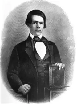 The voters returned Sherman to office for a third term during 1858.[35] After a brief special session in March 1859, the 36th Congress adjourned, and Sherman and his wife went on vacation to Europe.[36] When they returned that December, the situation was similar to that of four years earlier: no party had an absolute majority. Republicans held 109 seats, Democrats 101, and the combination of Oppositionists and Know Nothings 27.[b][37][38] Again, sectional tension had increased while Congress was in recess, this time due to John Brown's raid on Harpers Ferry, Virginia.[38] The election for Speaker of the House promised to be contentious.[37] This time, Sherman was among the leading candidates, receiving the second-largest number of votes on the first ballot, with no candidate receiving a majority.[39] The election for Speaker was sidetracked immediately by a furor over an anti-slavery book, The Impending Crisis of the South, written by Hinton Rowan Helper and endorsed by many Republican members.[40] Southerners accused Sherman of having endorsed the book, but he protested that he had only endorsed its use as a campaign tool and had never read it.[41] After two months of balloting, no decision had been reached.[42] After their attempts to adopt a plurality rule failed, Sherman accepted that he could not be elected, and withdrew.[42] Republicans then shifted their support to William Pennington, who was elected on the forty-fourth ballot.[43]