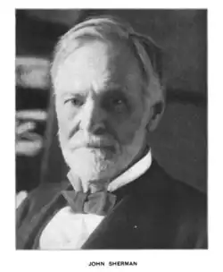John Sherman (May 10, 1823 – October 22, 1900) was an American politician from Ohio who served in federal office throughout the Civil War and into the late nineteenth century. A member of the Republican Party, he served in both houses of the U.S. Congress. He also served as Secretary of the Treasury and Secretary of State. Sherman sought the Republican presidential nomination three times, coming closest in 1888, but was never chosen by the party.