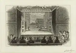 The John Street Theatre at 15 John Street opened in 1767; it was the first permanent playhouse in the city. It was set 60 feet back from the street, with a wooden covered walkway from the pavement to the doors. Inside, it had two tiers of boxes, a pit and a gallery. The dressing rooms and green room were originally located under the stage.[9] It was the New York base of the touring American Company. The theatre was closed temporarily in 1774 by the Continental Association which banned stage plays as extravagant and dissipated, and the company left for Jamaica. When the British occupied the city it was re-opened to boost troop morale.[10] Major John André's scene-painting was much admired.[11] After the Revolution the American Company returned and resumed performances. George Washington visited the theatre in 1789 to see The School for Scandal.[11] The building was demolished in 1798; the site was later occupied by a branch of Brasserie Les Halles.