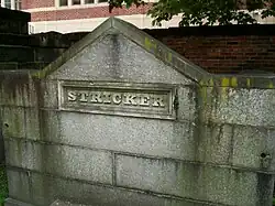 General Stricker is buried at Westminster Hall and Burying Ground, the old Western Burying Grounds of the First Presbyterian Church (later became the Westminster Presbyterian Church which surmounted the cemetery) at North Greene and West Fayette Streets in western downtown Baltimore.