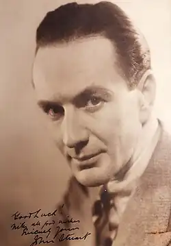 After a brief spell working in the family firm’s London office, against his family’s wishes he decided to try a career as an actor, using the stage name John Stuart.[5] Despite having no acting training, he made his stage debut as an extra in a 1919 production of The Trojan Women at the Old Vic theatre, then appeared as the juvenile lead in a six-month tour of The Chinese Puzzle.[6] The film producer and director Walter West, who thought he had ‘a film face’, asked him to play a small role in his 1920 silent film Her Son, for which he was paid three guineas a day. The film was shot at Broadwest Company's studio in Walthamstow.[7] This led to him being cast that year in two other films for West The Great Gay Road and The Lights of Home, after which he decided to concentrate on a film career. He was then cast as the famous Welsh violinist David Morgan, the lead role in Land of My Fathers. Having received good notices, he went on in 1922 to play the romantic lead in Sinister Street, A Sporting Double and If Four Walls Told, while 1923 found him appearing in This Freedom, The School for Scandal and The Loves of Mary, Queen of Scots.[8] During a slump in the British film industry he returned to the stage, making his debut in the West End as Lord Bleane in Our Betters, Somerset Maugham's withering attack on contemporary society, which ran for 548 performances.[9] During this period he worked in the film studios during the day and at the theatre in the evenings.