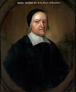 John Sudbury was Dean[1] of Durham[2] from his installation on 15 February 1661 until his death on 29 November 1684.[3] He was born at Bury St Edmunds in 1604, educated at Emmanuel College,[4] Cambridge[5] and ordained in 1629. He was Vicar of Leigh, Kent[6] from 1639 to 1642 and a Prebendary of Westminster from 1660 to 1661.[7]