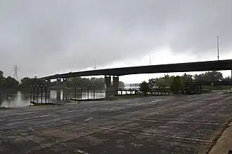 The John T. McNaughton Bridge, also known as the Pekin Bridge, is a steel girder bridge that carries Illinois Route 9 over the Illinois River from downtown Pekin to Peoria County in central Illinois. The John T. McNaughton Bridge was built in 1982 to replace a steel truss with a movable span.[2] The bridge was constructed with a 75 foot clearance in order to allow river navigation, and it has a length of 2,634 feet.[2]