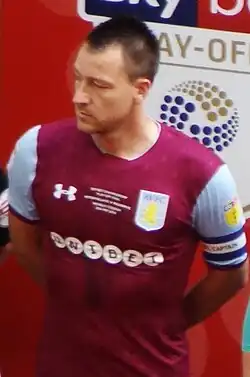 On 3 July 2017, Terry signed a one-year contract with Championship club Aston Villa on a free transfer.[117] He was appointed as the captain for the 2017–18 season.[118] He made his debut for Aston Villa on 5 August 2017 in a 1–1 home draw with Hull City in the Championship.[119] Terry scored his only goal for Aston Villa in a 2–1 victory over Fulham in the Championship on 21 October.[120]