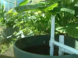The first "Living Machine" was created at Findhorn Ecovillage in Moray, Scotland in 1995.[3] For its design, John Todd drew on the work of Käthe Seidel and H.T. Odum.[3] The system had to accommodate wastewater from an ongoing population of about 300 residents, and a seasonally fluctuating population of as many as 10,000 visitors per year.[19] The resulting installation resembles a tropical conservatory garden. Every organism provides food for the next step in the food chain until the cycle is complete.[3]