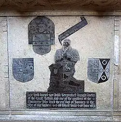 He was buried, and his monument was raised, in the presbytery north of the sanctuary (now forming the north aisle) in the magnificent surroundings of Milton Abbey church. The monument is an altar tomb of Purbeck marble, the chest, with quatrefoil panels enclosing plain shields, supported on a moulded plinth. Over this, supported forward on two barley-twist columns which rise into octagonal corner turrets, is a stone canopy with a frieze of quatrefoils with pierced foliate cresting above. The underside of the canopy is carved with ornamental tracery, with two pendants (as from a pendant vault) from which the finials are missing.[4][45]