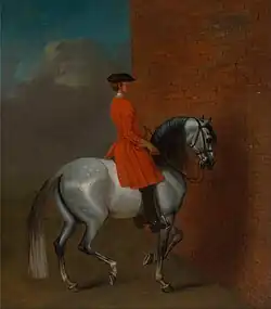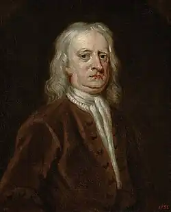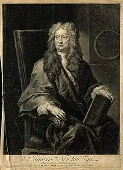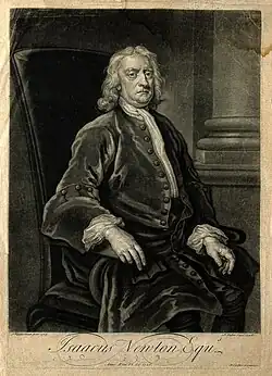 Vanderbank's most characterful and distinguished portraits are generally of the 1720s including the great patron of Handel and of the arts the Duke of Chandos (1722), the two portraits of Sir Isaac Newton (1725 and 1726), the painter George Lambert (untraced but engraved by Faber in 1727), the eccentric Newmarket trainer Tregonwell Frampton (c.1725), the poet James Thomson (1726), and the sculptor John Michael Rysbrack (c.1728). Ellis Waterhouse considered that Vanderbank's masterpiece was the large full-length of Queen Caroline (1736). Vanderbank painted three allegorical subjects incorporating an equestrian portrait of George I for the decoration of the staircase at 11 Bedford Row, London, and contributed The Apotheosis, or, Death of the King (1727) to the series of ten paintings by various artists, including Chéron and Peter Angelis, engraved in 1728 and advertised by John Bowles as Ten Prints of the Reign of King Charles the First. By contrast, some of Vanderbank's later portraits of ‘persons of Quality’, male or female, are technically well painted but can betray a lack of rapport with his sitters and a tendency to rely on stock poses sometimes directly derived from van Dyck. Vertue noted that, like many portraitists of the period, Vanderbank sometimes used the services of the drapery painter Joseph Van Aken from the mid 1730s.[28][29]
