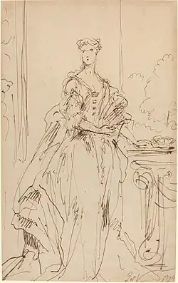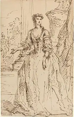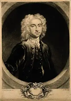Vanderbank's Academy was short lived but had an important influence on the development of English art, not least by furthering the introduction in England of life drawing classes for promising students such as Hogarth, Joseph Highmore, William Kent, John Faber, John Ellys and James Seymour.[13] Moreover in leading the academy Vanderbank was at the centre of an influential artistic hub enjoying the patronage of the wealthiest aristocrats, largely responsible for shaping the taste and cultural life of England in the 1720s and 1730s, encompassing art, architecture, music and the landscape. For example when William Kent joined Vanderbank's Academy he was already painting interiors at Cannons for James Brydges, 1st Duke of Chandos,[14] the princely palace designed by James Gibbs whom Vanderbank had known since Kneller's Academy, and in 1722 Vanderbank painted a portrait of the Duke of Chandos which has in the background the great basin lake created at Cannons (of which Nicholas Hawksmoor said "I cannot but own that the water at Cannon's... is the main beauty of that situation and it cost him dear",[15] and in 1727 Hogarth, probably on Vanderbank's recommendation, was invited to paint a cartoon of The Element of the Earth for Joshua Morris, the tapestry maker of Great Queen Street, for some hangings for Cannons, so initiating Hogarth's painting career.[16] The Duke of Chandos had installed Handel as musician in residence at Cannons,[17] where he composed the Chandos Anthems and his first oratorios, and in 1719 was one of the principal founding subscribers to the Royal Academy of Music to ensure a steady supply of baroque opera under Handel's aegis. Vanderbank was a frequent concert goer, drawing a caricature of Senesino, Cuzzoni and Berenstadt in a scene from Handel's Flavio in 1723,[18] which was anonymously etched and engraved, and in the same year painting the portrait of the leading soprano, and later contralto, Anastasia Robinson, Countess of Peterborough, of which Faber produced a popular mezzotint in 1727.