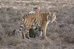 The project was the subject of controversy after accusations by investors and conservationists of manipulating the behaviour of the tigers for the purpose of the production of the film Living with Tigers, with the tigers believed to be unable to hunt.[17][18][19] Stuart Bray, who had originally invested a large sum of money in the project, claimed that he and his wife, Li Quan, watched the film crew "[chase] the prey up against the fence and into the path of the tigers just for the sake of dramatic footage."[17][18][19] Quan and Bray also accused them of financial mismanagement after a legal audit uncovered that he had borrowed R5.7-million of the funds for extraneous and personal expenses.[20] Quan and Bray subsequently established the Save China's Tigers Laohu Valley Reserve, also near Philippolis.