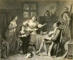 Wright painted domestic and sentimental subjects in the style then popular, and also historical compositions, notable for their detailed depictions of costumes; the plays of Shakespeare were a frequent source of inspiration.[3] Engravings of his pictures featured in publications such as "The Keepsake", "The Literary Souvenir", and Heath's "Book of Beauty",[4] "The Drawing-room Scrap Book", and "The Female Characters of Shakespeare".[5] His portraits of Lord Tenterden, Bishop Gray, and Bishop Marsh were engraved for Fisher's "National Portrait Gallery".[1]