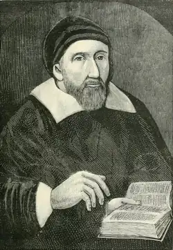 Wilson was first formally educated at Eton College, where he spent four years, and at one time was chosen to speak a Latin oration during the visit of the duc de Biron, ambassador from the court of Henry IV of France.[7] The duke then gave him a special gift of a gold coin called "three angels", worth about ten shillings.[6][1] On 23 August 1605, at the age of 14, Wilson was admitted to King's College, Cambridge.[2] While there he was initially prejudiced against the Puritans, but changed his stance after reading Richard Rogers' Seven Treatises (1604), and he subsequently traveled to Dedham to hear Rogers preach.[4][6] He and other like-minded students frequently met to discuss theology, and he also regularly visited prisons to minister to the inmates.[8] He received his B.A. from King's College in 1609/10,[2] then studied law for a year at the Inns of Court in London.[9] He next attended Emmanuel College, Cambridge, noted for its Puritan advocacy, where he received his M.A. in 1613.[2][9] While at Emmanuel, he likely formed a friendship with future New England divines, John Cotton and Thomas Hooker.[9] He was probably soon ordained as a minister in the Anglican Church, but records of this event are not extant.[2]