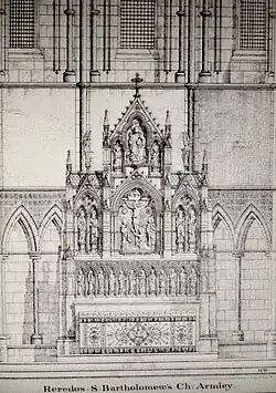 St Bartholomew's, Armley, Leeds, was founded in 1872,[42] and consecrated in 1877. The Caen stone reredos of this church erected in 1877 has alabaster carvings,[43] representing the Magi, crucifixion and Old Testament figures.[44] Appleyard was present at the consecration on 24 August 1877, listed alongside the architects Henry Walker and Joseph Athron who designed the building and reredos. Since no other stone carver is credited for this work, it is reasonable to suppose that it could be the work of Appleyard.[45]