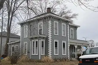 John and Caroline Stonebraker House is a historic home located at Hagerstown, Wayne County, Indiana. It was built about 1875, and is a two-story, "L"-plan, Italianate style frame dwelling with a bracketed hipped roof. It is clad in Dutch-lap board with wooden quoins at each corner. It features a wraparound Eastlake movement style porch added about 1890.[2]: 5