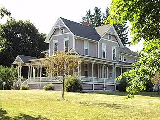 The Hevener House is one of the most elaborate Queen Anne-styled residences in Lapeer, distinguished by the ornateness, complexity and delicacy of its Queen Anne-inspired detailing. It is a two-and-one-half-story house with irregular massing, varied exterior wood surface treatments, and a large wrap-around porch with decorative supports. The house sits on a stone foundation and is covered with clapboard, and shingling and vergeboards in the main gables, gable corners, and gabled pediments of the porch roof. There is a bay window on one east facade and small pointed attic windows in the gable ends.[2]