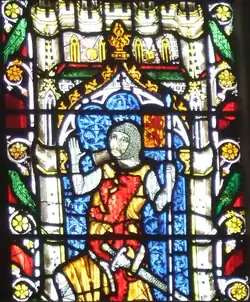 ![]() The fourteenth-century stained glass window thought to represent Charleton, now in St Mary's church, Shrewsbury. | |
