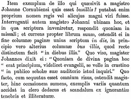 Another example (of the illatinity of contemporary clergy) is the scholar who asked his master John of Cornwall: Who was Busillis? He thought it was the name of a king or another great man. When John asked him in which book he had found the expression, the scholar answered: in the missal. And fetching the book, he showed his master at the end of one column the words in die and at the beginning of the next the word busillis - which, correctly grouped, makes in diebus illis. Master John, seeing that, said to him: "Considering that the word originates from a holy page, that is from the gospel, I will inquire it tomorrow with the audience in my public lesson." The master did so, and answered by the laughter of all, he took the occasion to show by more examples what shame and scandal was brought over the clergy by their dark ignorance and illiterateness.