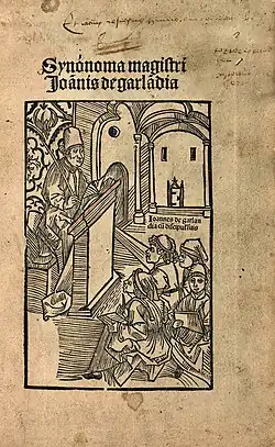 John of Garland was born in England, and studied at Oxford and then at the medieval University of Paris, where he was teaching by 1220. He lived and taught on the Left Bank at the Clos de Garlande, after which Rue Galande is named. This is the origin of the name by which he is usually known. The main facts of his life are stated in his long poem De triumphis ecclesiae ("On the triumphs of the Church").[1]