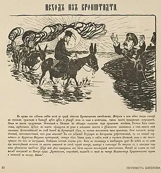- ^ "Во время оно случися смутъ велiй во граде некоемъ Кронштадтомъ именуемомъ. Матроси и иніи мужи мнози скокаху по стогнамъ градскимъ и убиваху другъ друга и резаху женъ со чады и домочадцы, тщася власти придержащiи испразднити. Оныя же власти предрожащiи Остелецкiй и Беляевъ во мундирiе облачении подъ кроватями нетленни, Господа Бога славословя, обретошася. Друзiи же власти офицерстiи во ризы и исподники женстiи и хулиганстiи облекошася, и сице животъ свой соблюдоша. Всечестнейшему же отцу Iоанну во Кронштедте сущу, се поликіи многочитіи чины притекоша: Отче всеблагіи, всетерпеливый, многомилостивый, чесо ради медлиши? Ты еси блудницу Порфирію во Богородицу хейротанисавый, ты еси піяницу горчайшего во Архангела Михаила претворивый, сътвори чудо: утиши брань и смутъ велій и скрежетъ зубовный, да бы и мы многогрешніи от него не пострадавша. Отвещав честный старецъ рече: Вас ли стонящихъ и мятущихся зрю? Не вкупе ли с вами азъ многогрешніи неисчестно с высоты амвонной ко сотне черной вопихъ, взывахъ и глаголахъ! Не матроси се, а любезные чада наша хулиганстіи мятутся! Духъ мой зело взыграяся ибо чуетъ избиеніе богомерзской интелдигенціи. Потеку на осляти ко чаду моему любезному во Питеръ градъ; "Кривошлыче, сладчайшій, возликуй со мной въ твоихъ Ведомостяхъ Градоначальства церкви и отечеству на пользу. Аминь" - Once in Kronstadt there was a mutiny. Sailors and other people ran around city streets and killed each other, and cut women with children and households, trying to overthrow the government. Representatives of the authorities: Osteletsky and Belyaev remained unscathed, as they lay under the beds in their uniforms and prayed to God. Other government officers dressed in women's clothes, or dressed like hooligans and thus saved their lives. Numerous people came to John, who was in Kronstadt, and addressed him with the words: "You are a father full of goodness, full of patience and always ready to promote the well-being of others. Why do you hesitate? You ordained harlot-Porfiria in Mother of God. You ordained bitter drunkard in Michael the Archangel. Make a miracle, calm down the war and a big rebellion, and a dental screech, so that we will not suffer". Honest elder answered: "Do not I see you groaning and restless? I am a sinner. I called out, yelled and addressed uncountable to the Black Hundred from the pulpit with you, is not it? These are not sailors, and our beloved children bully commit mutiny! My soul is indignant and feels that there will be a beating of the wicked intellectuals! I will run on donkey to my beloved son in St. Petersburg, where I'll tell him: "Krivoshlyk, sweetest, rejoice with me in your newspaper «Vedomosti of the St. Petersburg City Government and the Metropolitan Police» of the church and the fatherland for good. Amen.