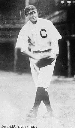 After completing the 1912 season in the Tri-State League, Bassler traveled to California to play winter league baseball.[9] There he played on the same team as Cleveland Naps shortstop, Ivy Olson. Olson persuaded Bassler to join the Naps for spring training camp in 1913. Bassler made his major league debut for the Cleveland Naps on July 11, 1913, one month after his 18th birthday.[2] He appeared in only one game for the Naps in 1913 – going hitless in two plate appearances and committing an error. In 1914, Bassler played in 43 games, 18 as the Naps' starting catcher. Though he compiled a .182 batting average he drew 15 bases on balls in 94 plate appearances to boost his on-base percentage to .323.[2]