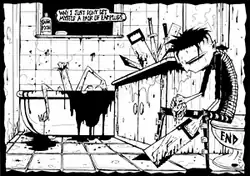 In the early 1990s, Carpe Noctem, a magazine about the goth subculture, published several one-page strips featuring Johnny, now called Johnny the Homicidal Maniac.[2][7] Though he never planned to create comic books,[1][8] Vasquez submitted samples of his artwork to alternative comics publisher Slave Labor Graphics.[2][5] Between August 1995 and January 1997, the publisher released a series of seven full-length issues based on the character.[9][10][11][12][13][14][15] Vasquez describes the production process for Johnny as a "mess" and a "spew".[3] As Vasquez worked on the comic, he prepared less and less, foregoing outlines and sketches and writing dialogue as he inked.[2][3] Vasquez wishes that he had taken more time to plan the series, and feels that the quality of the dialogue suffered from his haphazard approach.[3]