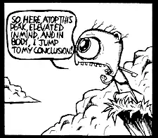 Wobbly-Headed Bob lives in a separate fictional universe from the main storyline, one inhabited by anthropomorphic animals who, with the exception of Bob, live in a state of innocence and bliss. In contrast, Bob is a megalomaniac who believes himself to be the most intelligent person in the world, and the only one who understands the true nature of reality, which he sees in entirely pessimistic terms. His extreme negativity leaves him isolated and depressed. He overwhelms anyone he meets with his despair and often causes them to either commit suicide or flee from him in horror.[23]