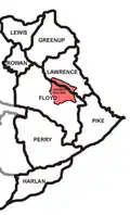 The county's highest point is Stuffley Knob, with an elevation of 1,496 feet (456 m).[10] Its lowest point is the Levisa Fork on the Lawrence County border, with an elevation of about 550 feet (170 m).[11]