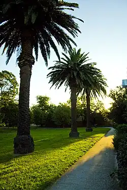 Johnson Park offers a range of features including open areas, garden beds, mature exotic and native Australian trees and shrubs, a pergola,[2] a playground and playground equipment, paths, seating, lighting, BBQ and rest facilities. The Park has many mature trees including elm, plane and oak trees as well as many silky oak[3] and eucalyptus trees. The Park also features a formal stand of Canary Island Palms on its northern boundary.