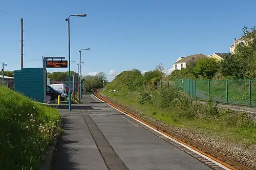 Johnston (Pembs) railway station is an unstaffed railway station in the village of Johnston in Pembrokeshire, Wales. It opened in 1856 as part of the final section of the South Wales Railway main line from Haverfordwest to Neyland. It has gone by various names and is now operated by Transport for Wales Rail. Train stops are made at the station by request only.