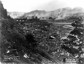 The Johnstown Flood, sometimes referred to locally as the Great Flood of 1889, occurred on Friday, May 31, 1889, after the catastrophic failure of the South Fork Dam, located on the south fork of the Little Conemaugh River, 14 miles (23 km) upstream of the town of Johnstown, Pennsylvania, United States. The dam ruptured after several days of extremely heavy rainfall, releasing 14.55 million cubic meters of water.[3] With a volumetric flow rate that temporarily equaled the average flow rate of the Mississippi River,[4] the flood killed 2,208 people[5] and accounted for US$17,000,000 (equivalent to about $590,000,000 in 2024) in damage.