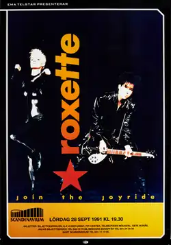 The "Join the Joyride! World Tour" was the third concert tour by Swedish pop duo Roxette. Their first tour to incorporate dates outside of europe, it was launched in support of their third studio album, Joyride (1991), and saw the band playing a total of 100 shows throughout Europe, Australia and the Americas. Canadian rock band Glass Tiger supported Roxette on all European dates, while support on the Canadian and US dates was provided by fellow Canadian pop groups World on Edge and West End Girls.