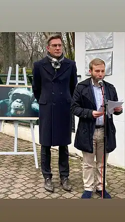 On 10 December 2022, International Animal Rights Day, the pathway crossing the Animal Space of the Pépinière was thus named after the famous chimpanzee.[9] In front of a crowd of citizens, Dahman Richter, delegate municipal councilor for animal rights and welfare, biodiversity, and Mathieu Klein, mayor of Nancy, inaugurated the plaques commemorating Jojo and the animals that accompanied him. Mr. Richter notably stated in his speech: