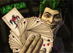 - The Joker's mythology is explored in Gotham through twin brothers Jerome and Jeremiah Valeska, both portrayed by Cameron Monaghan.[10][11][12] Believing that the Joker should not precede Batman, showrunner Bruno Heller initially did not want to use the character,[13] but later decided to "scratch the surface" of his origin because "this is America — nobody wants to wait."[14] Jerome is introduced in the first season as the mentally unhinged son of a nymphomaniac circus performer. Despite being killed at the start of the second season, he becomes a martyr for various Gothamites.[15] While Monaghan was not comfortable drawing from the previous live-action actors who had played the Joker, he took influence from Mark Hamill in his performance as well as various comic books featuring the character.[16] In the fourth and fifth seasons, Jeremiah was introduced, with the intention that he would represent different characteristics of the Joker. While it was never confirmed whether he would go on to become the Joker following the series finale,[17] the DC FanDome documentary Joker: Put on a Happy Face included Jeremiah among the various iterations of the character adapted for film and television across his 80-year history.[18]