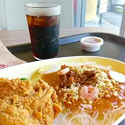 The Chickenjoy is a crispy fried chicken meal.[32] The meal can be ordered with several sides, including rice and gravy, fries, buttered corn, and spaghetti.[33][34]