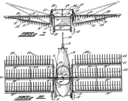 By 1931 there was still no working prototype, and Caldwell moved to Orangeburg, New York, and later to Madison, New Jersey.[5] A January 14, 1932 newsreel film shows the ornithopter being readied for a test. This was apparently attempted without success, by the otherwise unknown Emile Harrier. Additional funds were then raised by another stock issue in order to build a full-sized prototype at Teterboro Airport. He also apparently restarted his cyclogyro work, and an article appeared in one of the Popular Mechanics-like magazines showing the design equipped with a V-8 engine mounted in an odd twin-fuselage with the pilot and passengers below.