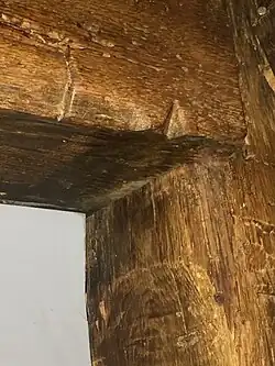 Typical of the early architecture of the colonial period, the construction of the Jonathan Green House is functional and straightforward.[4] When originally built, the house would have been located near the seventeenth century borders of Charlestown and Malden, Massachusetts, in what is now Stoneham. It was a single cell: a single room of two structural bays, plus an end chimney bay with the primary entrance and staircase located in front of the chimney stack. Pairs of pin holes in the front girt indicate the use of single-story studs and earlier, possibly asymmetrical, window placement. The area to the east of the chimney was used as a stable.[5] Currently, the main block is two and a half stories high, five bays wide, and one room deep, with a central chimney, a granite foundation and clapboard sheathing.[4] However, cedar shingle evidence survives under the added lean-to on the North side. The centered entrance had been framed by simple pilasters and topped by a modest entablature (no longer extant). Single story ells project from the northeast and northwest corners.