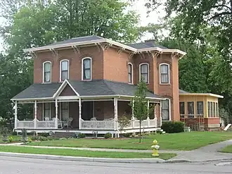 The Jones–Read–Touvelle House is a historic building in Wauseon, Ohio, United States. Located along Park Street south of downtown,[1] this ornate brick house sits on a corner lot adjacent to a city park. Architectural historians have seen the Jones–Read–Touvelle House as a fine example of the combination of multiple architectural styles: most of the house itself appears to be Italianate, but the porch and some of the other details are plainly those of the Queen Anne style.[2]