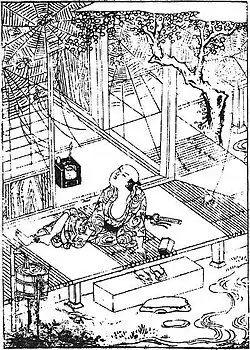 "How Magoroku Was Deceived by a Jorōgumo" ("Magoroku Jorōgumo ni Taburakasareshi Koto",孫六女郎蜘にたぶらかされし事) relates the story of Magoroku dozing in his veranda in Takada, Sakushu (now Okayama Prefecture). As he was about to doze off, a woman in her 50s appeared. She said that her daughter had taken a fancy to Magoroku and invited him to her estate. There, a 16- or 17-year-old girl asked him to marry her. Already married, he declined, but the girl persisted. She claimed that he had almost killed her mother two days before, and yet she still visited him, and surely he could not let her feelings come to nothing. Bewildered, Magoroku fled. The house disappeared as he ran and he found himself back on his own porch. Magoroku's wife then assured him that he had been sleeping on the veranda the whole time. Concluding it was only a dream, Magoroku looked around and noticed a small joro spider that had made a tight web around the eaves. Relieved, he recalled how he drove away a spider two days before.[3]