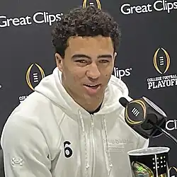 ![]() Faison talking to press ahead of the 2025 CFP National Championship. | |