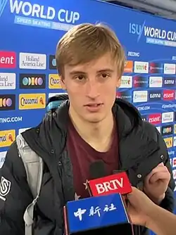 At 17 years of age he made his senior international debut at ISU World Cup Speed Skating #3 (December 3–5, 2021) in Kearns, Utah, at the Utah Olympic Oval. On December 3, 2021, he finished last of 41 competitors in the first 500m division B race.[15] Two days later he won the second 500m division B race in 34.31 seconds, breaking his own junior world record.[16][17] Later that same day he set a second junior world record, this time in the 1000 meters, when he skated a time of 1:07.03 to place third in the division B race.[18][19] He was promoted to the 500m and 1000m division A for the next World Cup races.