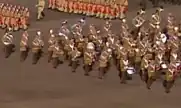 The Jordanian Armed Forces Band (Arabic: فرقة القوات المسلحة الاردنية) is the main musical unit of the Royal Jordanian Army made up of musicians who perform in official settings usually in the presence of the Jordanian royal family. When performing, all band members wear red and white checked Keffiyehs alongside their full dress uniform.[1] The band was established in 1921, with a core of 10 musicians who served with the Arab Army. In 1929, bagpipes from the area that is now Egypt and Syria were first introduced to the band.[2] In 1982, Hussein of Jordan approved the use of the band for purely ceremonial purposes. Today, the full band is composed of over 500 musicians who are arranged in a similar fashion to the Bands of the Household Division.[3][4][5][6]