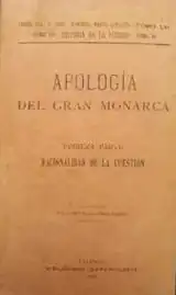 In the early 1900s Corbató developed his own political theory. Auto-identified as españolismo, it was laid out in some 20 booklets[69] published in Valencia between 1900 and 1905;[70] the best known work is Apología del Gran Monarca.[71] Corbató's españolismo was a highly providentialist, millenarian doctrine which combined exalted patriotism and religious zeal. Based on assumption that the global liberal order would undoubtedly collapse[72] it envisioned ultimate advent of a universalist monarchy.[73] In a regenerationist tone Corbató hinted that the impulse might come from Spain, which would regain imperial status as a Hispanic commonwealth.[74] He remained ambiguous as to the future monarch.[75] Scholars reconstruct his españolismo as "a form of anti-liberal Spanish nationalism,[76] founded on ultramontane Catholicism and Traditionalism, with the objective of building a moderate, regionalist monarchy and corporative society".[77] One historian sees Corbató's españolismo as an attempt to modernize Traditionalism;[78] another presents it rather in terms of mysticism and esoterism.[79]
