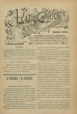 Back in Spain Corbató – by scholars considered possessed by "obsesiva dedicación al campo de la prensa"[60] – resumed labors to launch a new periodical. He obtained some donations from friends and relatives, was prepared to mortgage his Villareal house and contributed his own meager savings to launch Luz Católica, a weekly which was first published in late 1900.[61] This time the periodical did not assume a clear party identity, sub-titled "Semanario critico de religión, ciencias y españolismo".[62] Initially the weekly might have seemed flavored with Carlism, e.g. when it questioned Traditionalist credentials of Polo y Peyrolón,[63] but soon it turned decisively against the party. Posing as a genuine Traditionalist voice, Luz Católica started to castigate cesarism and hypocrisy of Carlos VII and his men, including the party leader Barrio y Miér; they allegedly opted for rapprochement with the Restoration system.[56] In 1903 Luz Católica was revamped as La Señal de Victoria,[62] but its editorial line remained the same.